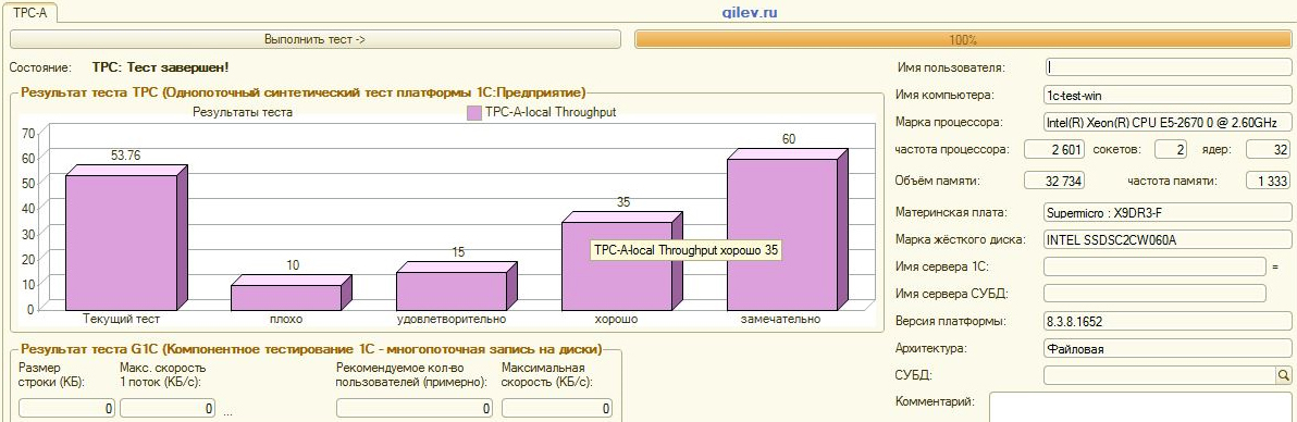 В наших испытаниях мы опираемся на два метода синтетической генерации нагрузки и имитации работы пользователей в 1С. Это тест Гилева (TPC-1C) и тест 1С «Тест центр» из инструментария 1С:КИП со специальными сценариями работы, запущенный на 50 пользователей.