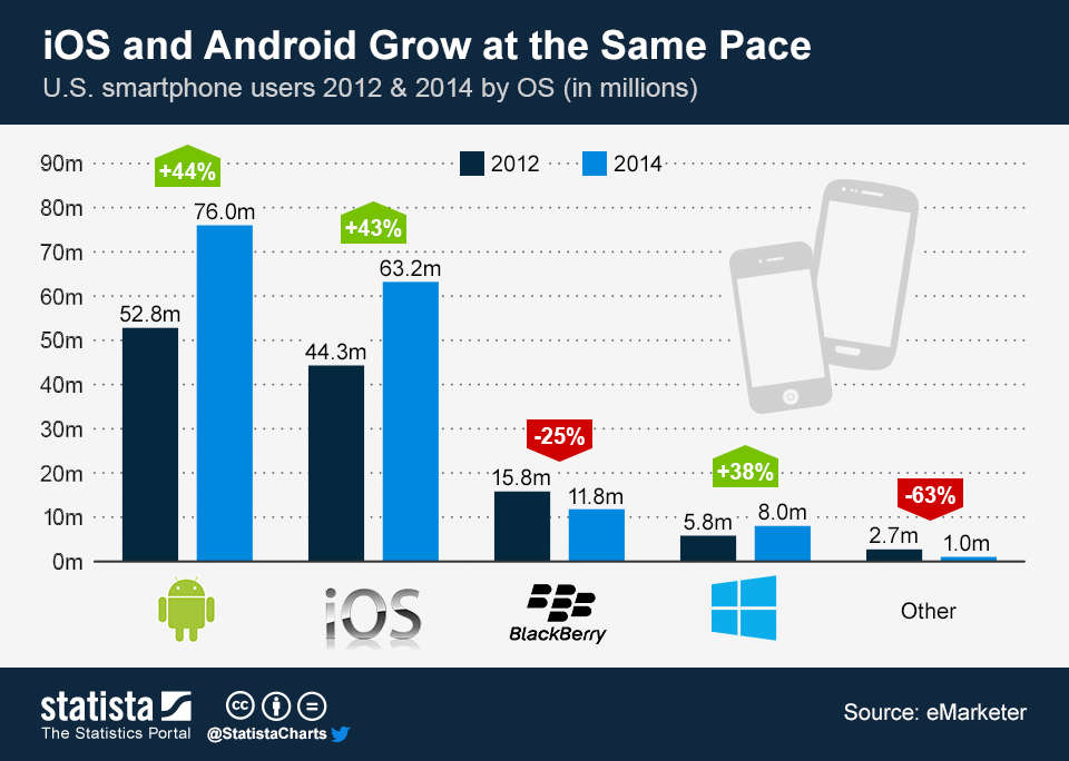 Эти двое соревнуются ноздря в ноздрю в США, Канаде и Великобритании. Любой спад популярности iOS извлекает выгоду из Android. Например, в Великобритании сейчас разница между двумя гигантами мобильных ОС составляет всего 0,32%. В Канаде тоже не все гладко: между ними доля рынка составляет всего 1,41%.Заключительные замечания