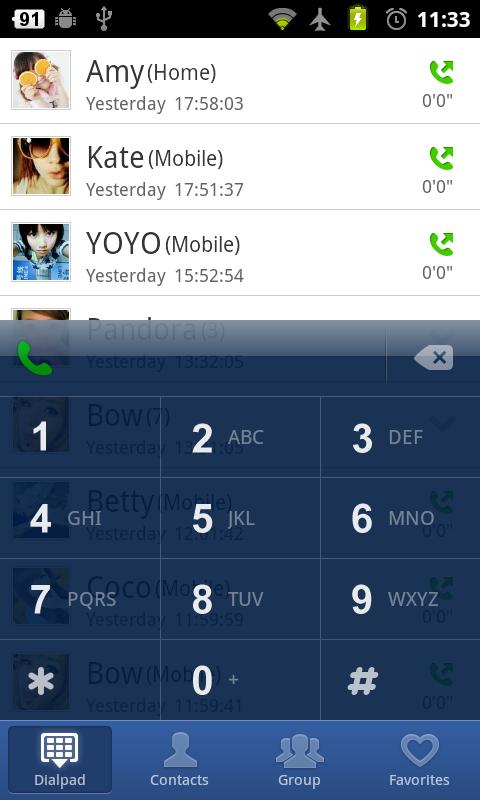 Приложение спокойно может участвовать в работе таких функций как журнал вызовов (пропущенные/входящие/исходящие), телефонная книга (а также редактирование ее), синхронизация номеров книги с SIM-картой.