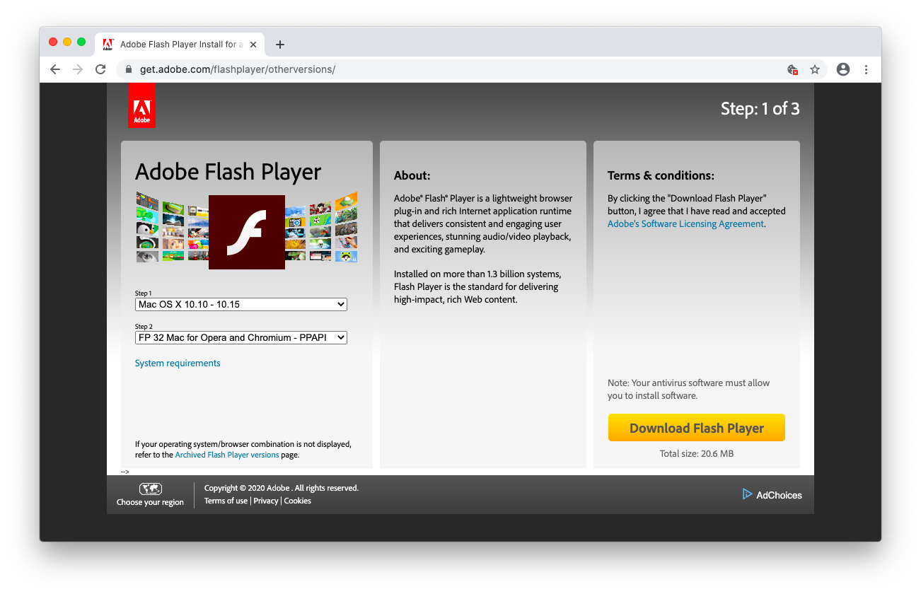 Adobe больше не позволяет загружать последнюю версию со своего веб-сайта, а последние версии были запрограммированы на прекращение работы в начале 2021 года. Подробнее о конце Flash