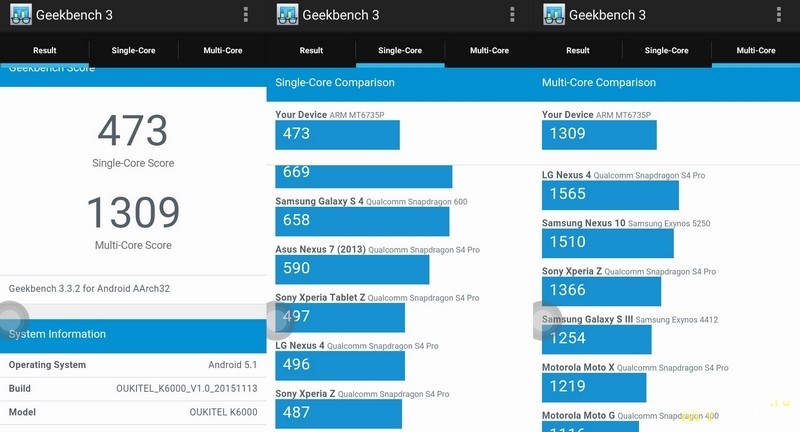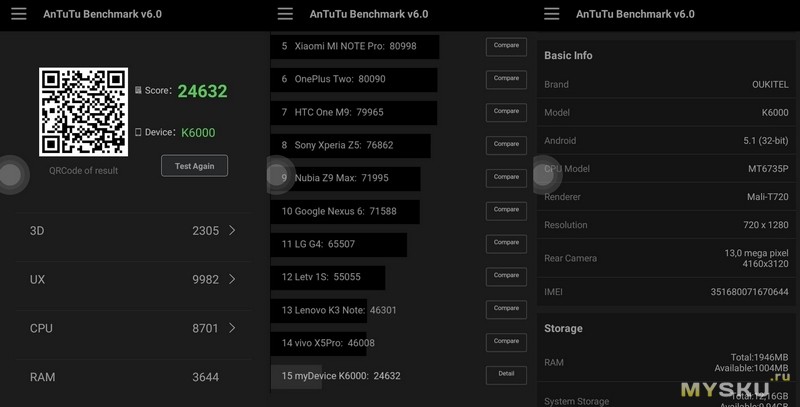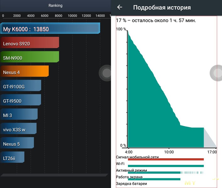 Вкупе с отличным запасом памяти, такой чипсет показывает отличные результаты во всех тестах. На фоне А-брендов K6000 Plus выглядит среднячком, но в реальных задач никаких намёков на подлаги или низкий FPS нет. Понятно, что мощность телефона избыточна на начало-середину 2017 года, но проектировалась модель на продажи в течение нескольких лет.