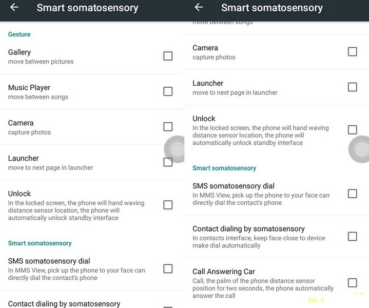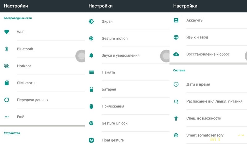 В настройках все стандартно для Андроид 5*, кроме настроек жестов и росчерков, которые даже не переведены на русский язык.