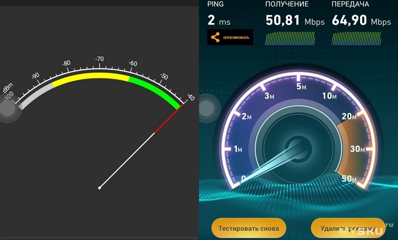 Через 2 бетонных стены сигнал незначительно слабеет, но скорость падает совсем незначительно.