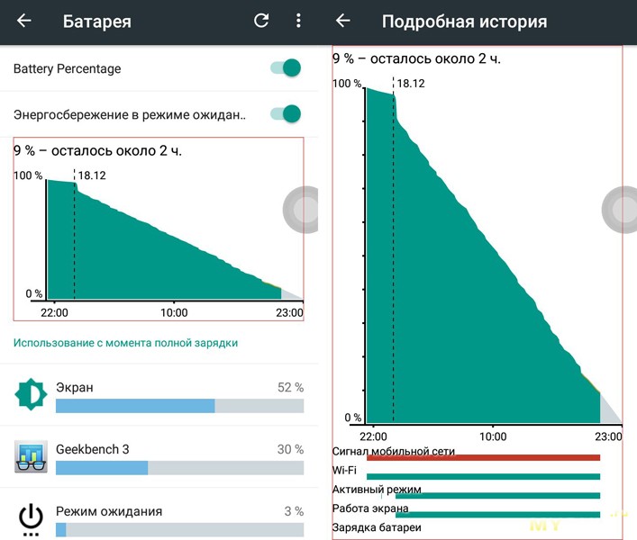 За два часа минус 13% заряда, за 3 часа — 21% за 6 часов — 43%.