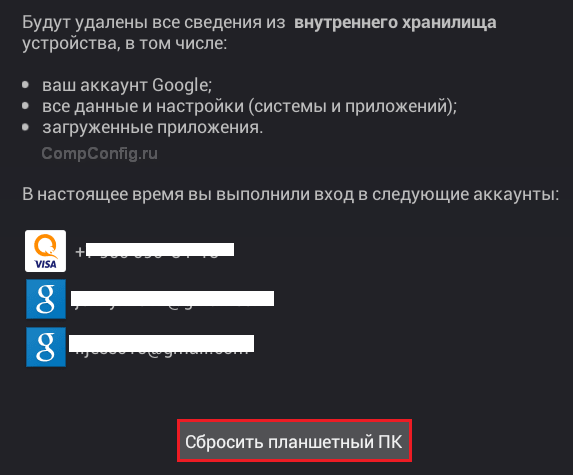 Предупреждение: некоторые планшеты и телефоны настолько крепко привязываются к аккаунту владельца, что требуют авторизации под ним даже после сброса и перепрошивки. И обойти этот запрос очень и очень непросто (единого решения нет, для каждой марки девайса оно свое). Поэтому пока у вас есть доступ к сведениям вашего аккаунта Google, запишите логин и пароль в записную книжку или файл на другом устройстве и храните в надежном месте.