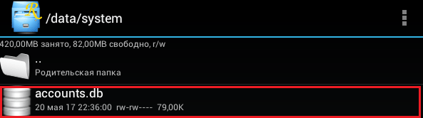 И так при выполнении вышеописанных двух условий- при помощи программы «Root Explorer» открываем корневой каталог Android и открываем папку с именем «data», а в ней- папку «system». Здесь Вы найдете файл «accounts.db».