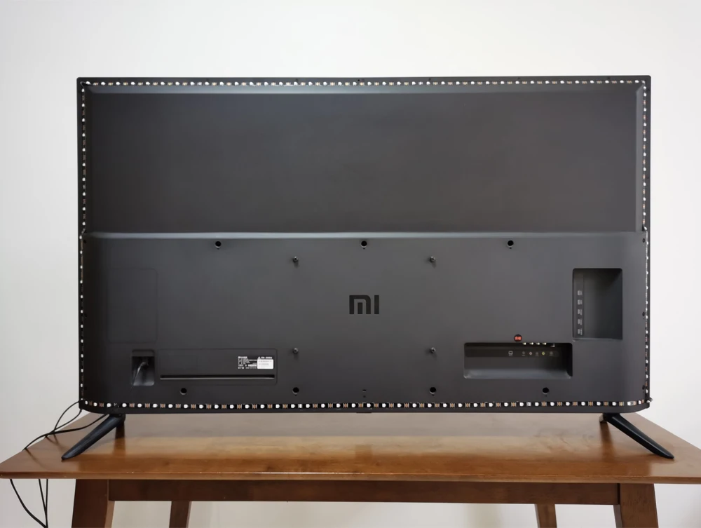 Вот так вот у меня все это получилось. На боковины у меня получилось по 40 светодиодов, на верхнюю 72 и нижнюю часть 74 светодиодов соответственно. Остался небольшой кусочек LED ленты, его просто отрезаем. Теперь на двухсторонний скотч монтируем умный блок и вешаем телевизор на место.