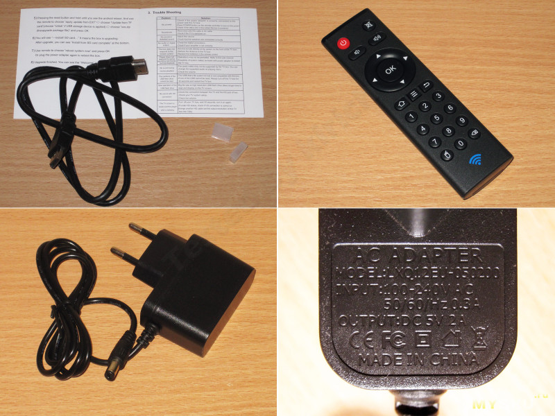Комплектация, как обычно, лежит на самом дне, и найти там можно: пульт ДУ (такой же, как у Tanix TX6S), блок питания на 12В 1А, в отличие от 5В/2А у TX6S; простой HDMI кабель на метр и бесполезную инструкцию.