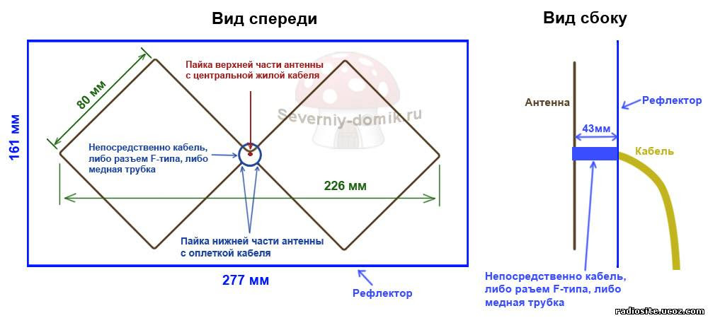 Её ещё называют антенной Харченко для 3G модема, или «восьмёркой». За её основу взят дециметровый ромбический волновод Харченко, который предложил, использовать эту конструкцию для приема ТВ каналов в ДМВ диапазоне. Я решил протестировать варианты конструкций, которые предлагают в сети на форумах, и результаты выкладываю сюда. При постройке антенны для 3G модема я внес кое-какие изменения. Сразу скажу, что антенна неплохо работает, но ждать от неё супер результатов не стоит. Она помогает усилить сигнал, но если он у вас отсутствует совсем, то вряд ли она вам поможет. Если сигнала GSM нет, то лучше использовать вариант 3G антенны собранной на спутниковой антенне.