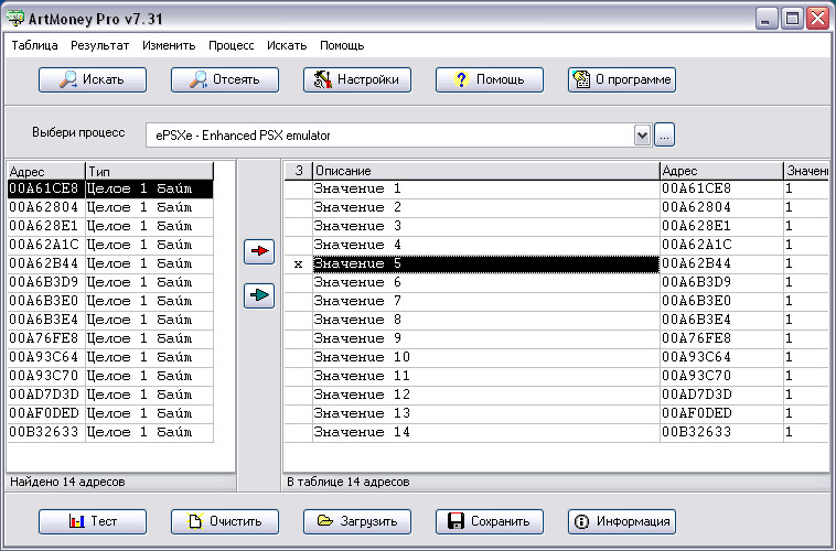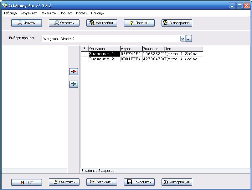 Нажимаем на зеленую стрелку и перемещаем найденные адреса в правое окно программы