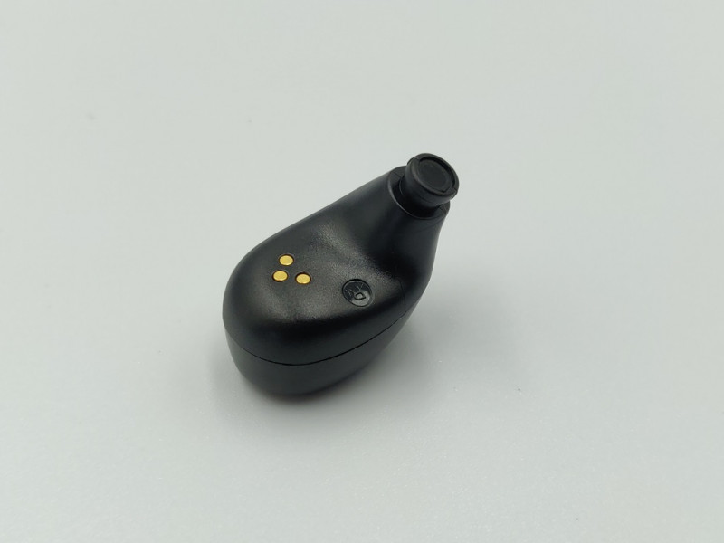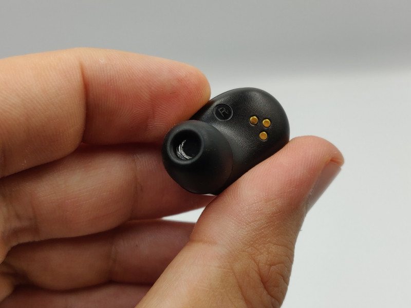 С обратной стороны каждый наушник имеет пометки L и R, а также три контактные площадки для зарядки