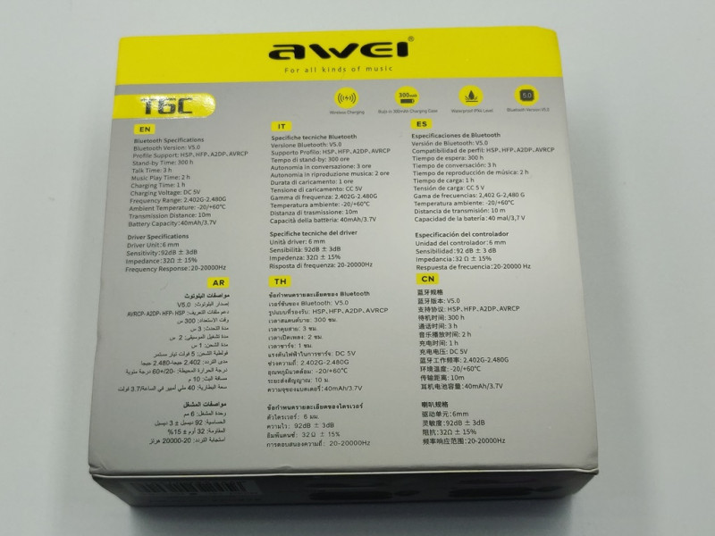 Наушники Awei T6C поставляются в картонной коробке с цветным принтом