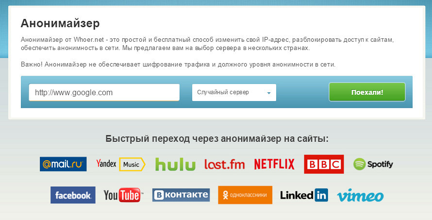 Анонимайзер – это специальный веб-сайт в Интернете, на который вы можете войти и ввести в специальное поле адрес веб-сайта, который хотите посетить, и попадаете на нужный вам веб-сайт, при этом веб-сайт записывает в свои журналы не ваш IP-адрес, а IP-адрес анонимайзера. При переходах на другие страницы этого веб-сайта также фиксируется IP-адрес анонимайзера до тех пор, пока вы не закроете окно или вкладку браузера, в котором вы изначально открыли анонимайзер.