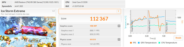 Повторный прогон теста 3DMark Firestrike Extreme 1.1, при таком разгоне, показал увеличение результата до 3840 тестовых пунктов, т.е. приблизительно на 6,5%.