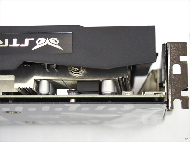 Радиатор охлаждения большой площади, длиннее платы. Он построен на трех тепловых трубках с диаметром около 1 см. Радиатор охлаждает только графическое ядро, с которым соприкасается по принципу прямого контакта тепловых трубок. Оребрение, увеличивающее площадь рассеивания тепла, совмещено с трубками посредством пайки.
