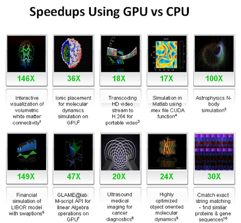 Это лишь некоторые примеры ускорений синтетического кода на GPU против SSE-векторизованного кода на CPU (по данным NVIDIA):