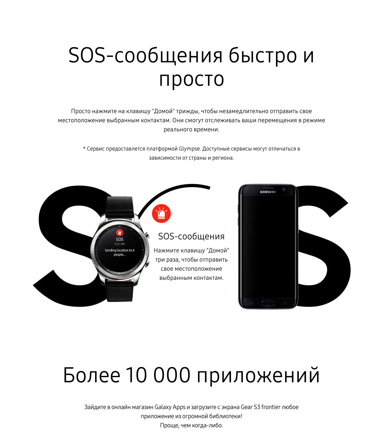 Главное достижение Samsung Gear S3 Frontier – наличие собственного модуля GPS/ГЛОНАСС. Теперь умные часы не зависят от смартфона – вы можете взять только их на пробежку или прогулку, и гаджет в точности отследит ваш маршрут. К тому же экономится заряд смартфона – не нужно включать на нем GPS и выполнять синхронизацию.