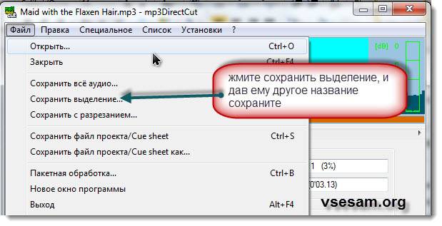 вырезать фрагмент из песни — нажмите значок «Ножницы» на панели задач сверху сохранить выделенную часть — кликните правой клавишей мыши по полю редактирования, выберите пункт «Сохранить выделенное»