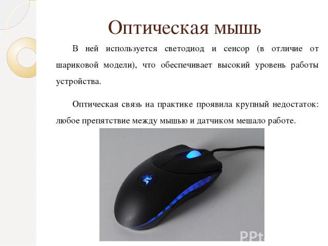 Такое устройство может работать практически на любой поверхности, кроме зеркальной, и в чистке не нуждается. Кроме того, такая мышка миниатюрнее и легче шариковой.