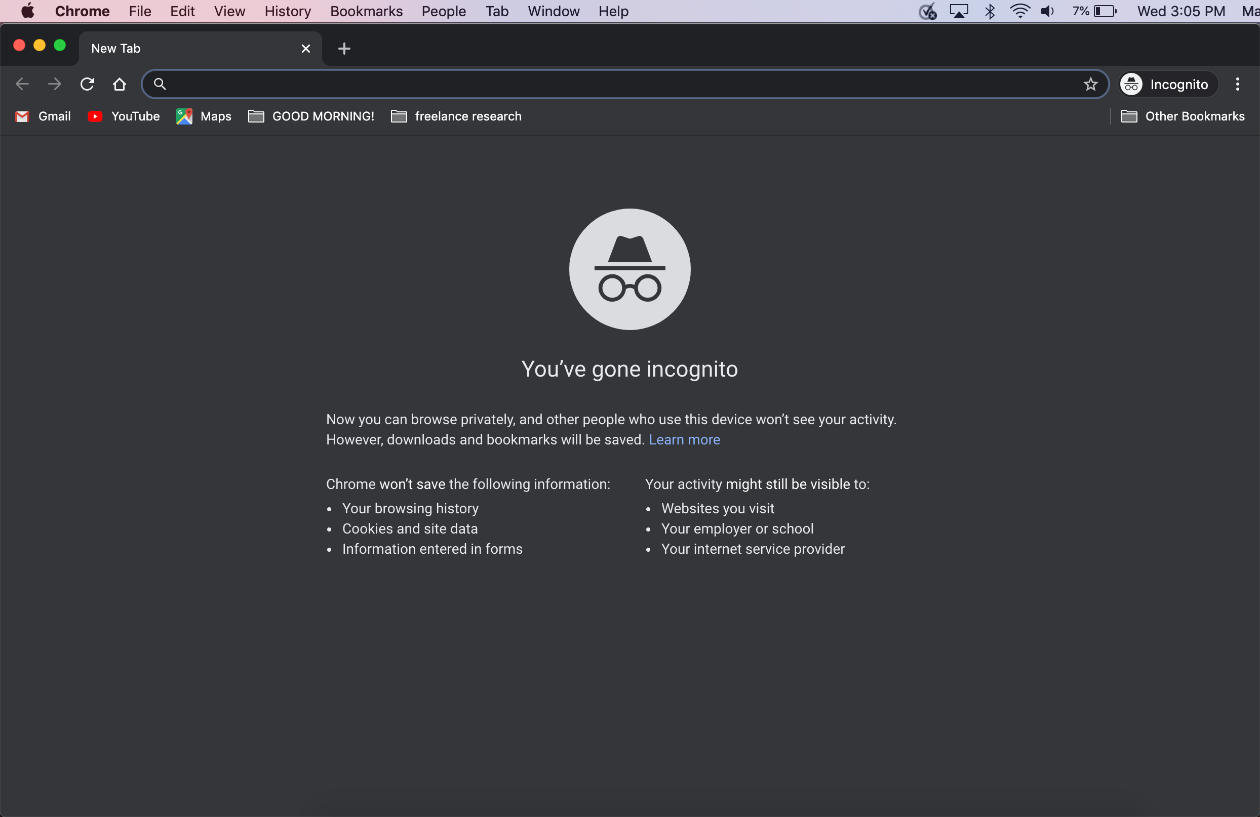 И вы можете проверить, что ваша текущая вкладка находится в режиме инкогнито, независимо от того, что на ней отображается, проверив строку меню Chrome.Рядом с омнибаром вы увидите это: