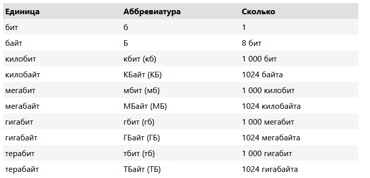 Так как бит — минимальная единица, в наше время для измерения скорости интернета используют мегабиты в секунду (Мбит/с или Mbps). 1024 бит = 1 килобит (Кбит). 1024 килобит = 1 мегабит (Мбит). Несколько примеров: