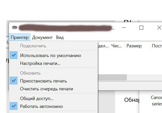 Еще один способ: найти пиктограмму принтера Canon, два раза щелкнуть по ней мышкой и проверить состояние. Если увидите надпись «Работа в автономном режиме», измените параметр, выполнив следующие действия: