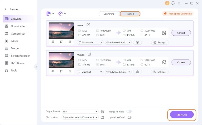 Перед преобразованием MP4 в MKV вы также можете изменить папку назначения в поле «Сохранить в». В конце нажмите кнопку «Конвертировать все», чтобы начать преобразование MP4 в MKV.