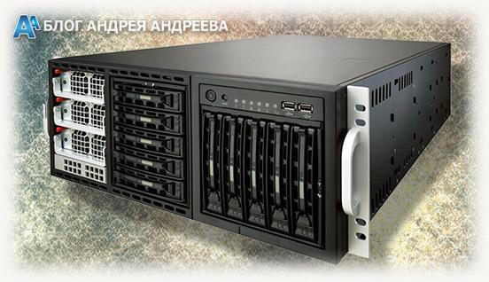 Для экономии места я совместил два фото в одно. Как видите это — достаточно дорогая «игрушка» (хотя и устаревшая). Этот корпус имеет запирающуюся на ключ переднюю панель, под которой удобно расположены три 5,25-ти дюймовых отсека (для оптических дисков или — «карманов») и шесть отсеков на 3,5 дюйма (для установки жестких дисков). При такой конструкции их очень легко извлекать и устанавливать.
