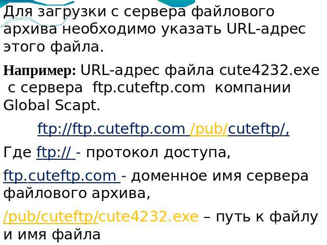 ниже.ftp://имя пользователя:пароль@сервер/%2Fpath/имяфайла.txtОбозначает файл