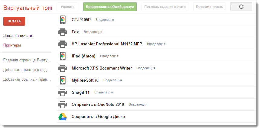 В списке принтеров доступна очень важная и интересная кнопка под названием «Предоставить общий доступ», которая позволяет дать доступ к тому или иному принтеру другому пользователю Google, даже если он не имеет к нему прямого доступа. Очень удобно делиться таким образом доступом к принтерам с коллегами и членами семьи. Это даст возможность использовать облачный сервис печати для передачи документов. Например, моя супруга хочет, чтобы я по пути домой забежал в банк и сдал анкету, которую она заполнила. В обычной ситуации она могла бы выслать мне этот бланк на почту и тогда я бы его распечатал. Но в случае использования облачной печати она просто распечатывает его на моем принтере в офисе, а я по пути домой просто беру бумагу из принтера и иду в сторону банка с готовым документом.