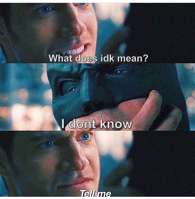 Кроме того, лучше учитывать контекст. Эта аббревиатура не является оскорблением, но формальному собеседнику она может показаться грубой. Это может быть связано с тем, что текстовая речь, такая как IDK , лучше всего подходит для случайных разговоров, таких как сообщения между друзьями или семьей.