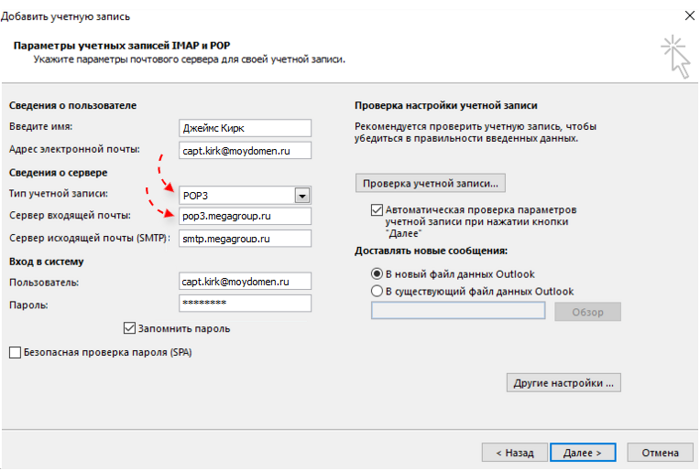 Видно, что я решил использовать два типа доступа к почте: IMAP и POP3. Дело в том, что иногда попадаются очень активные пользователи с очень большим объёмом почты. Если такой пользователь не использует почту нигде, кроме своего ПК на рабочем месте (не забываем про OWA), то в случае Outlook создаются локальные папки и назначаются основными для всех учётных записей.