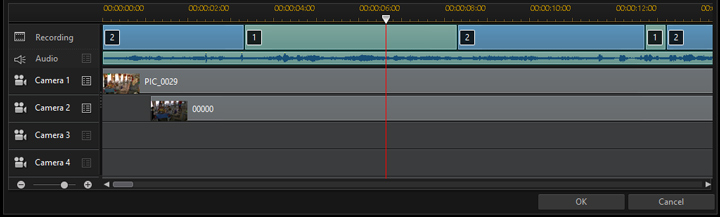 ΠΠ°ΠΊ ΠΌΠΎΠΆΠ½ΠΎ Π²ΠΈΠ΄Π΅ΡΡ Π½Π° ΡΠΊΡΠΈΠ½ΡΠΎΡΠ΅ Π²ΡΡΠ΅, ΠΈΠΌΠ΅ΡΡΠΈΠΉΡΡ Π² PowerDirector ΠΌΠΎΠ΄ΡΠ»Ρ Π΄Π»Ρ ΠΌΡΠ»ΡΡΠΈΠΊΠ°ΠΌΠ΅ΡΠ½ΠΎΠ³ΠΎ ΠΌΠΎΠ½ΡΠ°ΠΆΠ° ΠΏΡΠ΅Π΄ΡΡΠ°Π²Π»ΡΠ΅Ρ ΡΠΎΠ±ΠΎΠΉ ΠΎΠΊΠ½ΠΎ Ρ ΠΈΠ·ΠΌΠ΅Π½ΡΠ΅ΠΌΡΠΌΠΈ ΡΠ°Π·ΠΌΠ΅ΡΠ°ΠΌΠΈ, ΠΊΠΎΡΠΎΡΠΎΠ΅ Π½Π°ΠΏΠΎΠΌΠΈΠ½Π°Π΅Ρ Π³Π»Π°Π²Π½ΠΎΠ΅ ΠΎΠΊΠ½ΠΎ ΠΌΠ°ΡΠ΅ΡΠΈΠ½ΡΠΊΠΎΠΉ ΠΏΡΠΎΠ³ΡΠ°ΠΌΠΌΡ. Π‘ ΠΎΠ΄Π½ΠΈΠΌ ΠΎΡΠ»ΠΈΡΠΈΠ΅ΠΌ: Π²ΠΌΠ΅ΡΡΠΎ ΠΊΠΎΠΏΠΈΠ»ΠΊΠΈ ΡΠ°ΠΉΠ»ΠΎΠ² ΠΈ ΡΡΡΠ΅ΠΊΡΠΎΠ² Π·Π΄Π΅ΡΡ ΡΠ°ΡΠΏΠΎΠ»ΠΎΠΆΠ΅Π½Ρ ΡΠ΅ΡΡΡΠ΅ Π½Π΅Π±ΠΎΠ»ΡΡΠΈΡ ΠΎΠΊΠ½Π°, ΠΊΡΠ΄Π° ΠΏΠΎΠΌΠ΅ΡΠ°Π΅ΡΡΡ ΠΌΠ°ΡΠ΅ΡΠΈΠ°Π» Ρ ΠΎΡΠ΄Π΅Π»ΡΠ½ΡΡ ΠΊΠ°ΠΌΠ΅Ρ. ΠΡΠ΅Π³ΠΎ ΠΏΠΎΠ»ΡΠ·ΠΎΠ²Π°ΡΠ΅Π»Ρ Π΄ΠΎΡΡΡΠΏΠ½ΠΎ ΡΠ΅ΡΡΡΠ΅ Π±Π»ΠΎΠΊΠ°, ΡΠΎ Π΅ΡΡΡ, Π²ΠΎΠ·ΠΌΠΎΠΆΠ΅Π½ ΠΌΠΎΠ½ΡΠ°ΠΆ ΠΌΠ°ΡΠ΅ΡΠΈΠ°Π»Π°, ΡΠ½ΡΡΠΎΠ³ΠΎ ΡΠ΅ΡΡΡΡΠΌΡ ΠΊΠ°ΠΌΠ΅ΡΠ°ΠΌΠΈ.