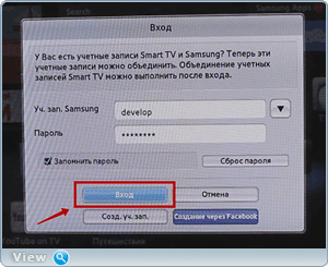 7. Выбираем учетную запись Smart TV Samsung. После создания учетной записи появится окно «Вход», выбираем созданную учетную запись «develop», вводим пароль, ставим галочку и нажимаем кнопку вход.