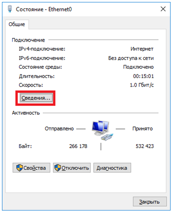 В окне просмотра состояния перейдите к свойствам. Далее выберите протокол IPv4 и откройте детальный просмотр.