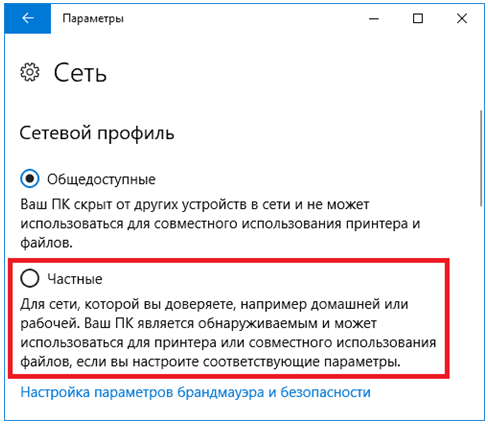 Также может потребоваться переключить в параметрах, в разделе подключения, тип сети с общественной на доверенный.