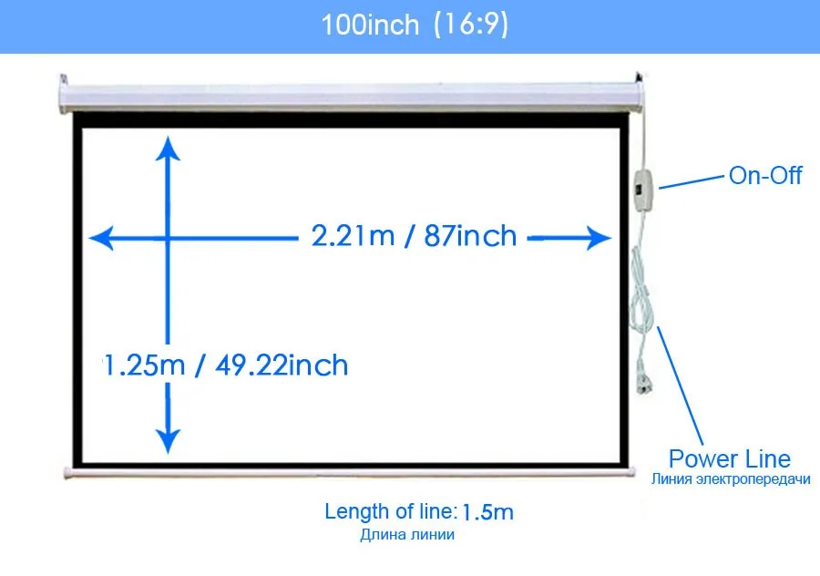 110-дюймовый экран проектора с соотношением сторон 4:3 будет иметь длину 88 дюймов (7,34 фута) и ширину 66 дюймов (5,5 футов). Моторизованный проекционный экран.