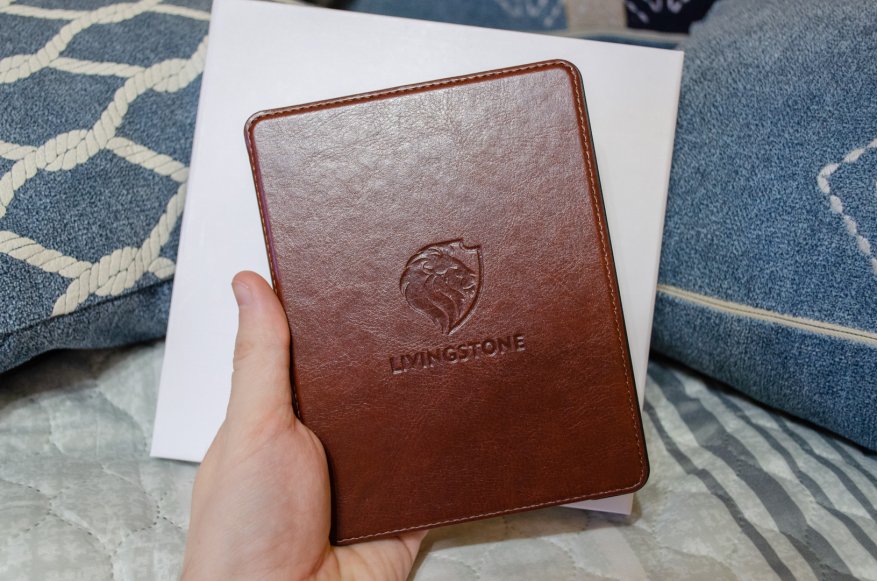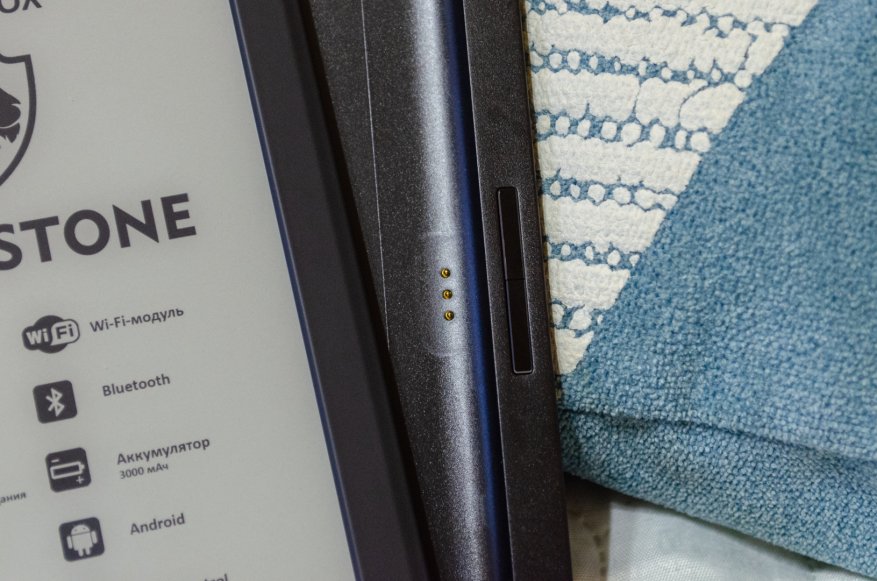 На Livingstone обложка не просто сидит, как влитая. Она буквально — важная часть электронной книги. Кнопки листания страниц, которые раньше располагались по бокам или под экраном, переместились на край рамки обложки. Они работают благодаря трем контактным площадкам на спинке электронной книги.