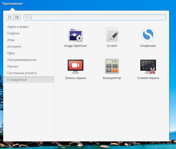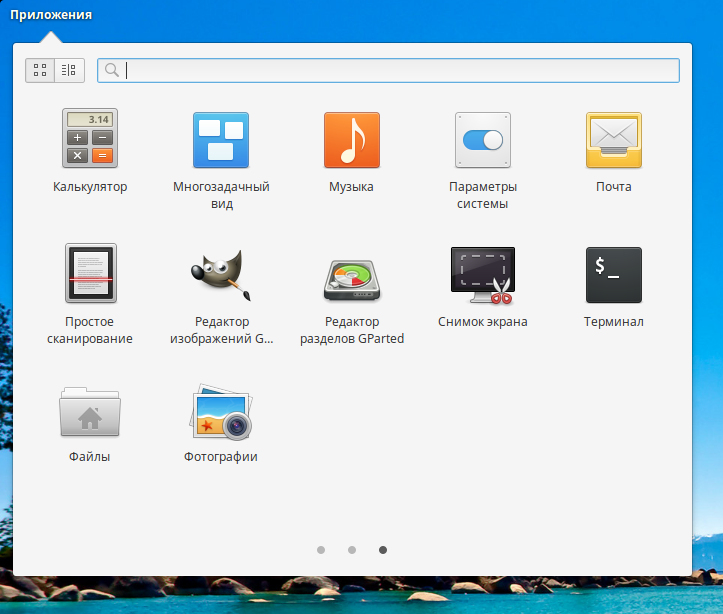 В левом верхнем углу, на панели расположено меню приложений, оно уже отличается от Gnome. Клик по кнопке открывает простой лаунчер, где перечислены все установленные приложения. Вы можете использовать прокрутку, чтобы посмотреть их все или же использовать список страниц внизу окна.