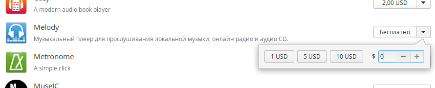 Немаловажно, что в магазине были созданы условия для мотивации разработчиков софта. Они могут своим программам назначать стоимость. Оплата не является обязательной. Но, если какая-то программа очень нравится, почему бы не пожертвовать на её развитие. Оплатить можно указанную стоимость, обычно чисто символическую, либо любую другую, на своё усмотрение.