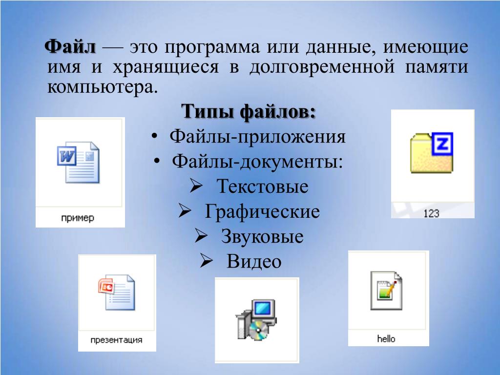Что такое файл ? Файлы в Windows отображаются с использованием специальных графических изображений, называемых значками. Внешний вид значков зависит от типа соответствующего им файлового объекта.