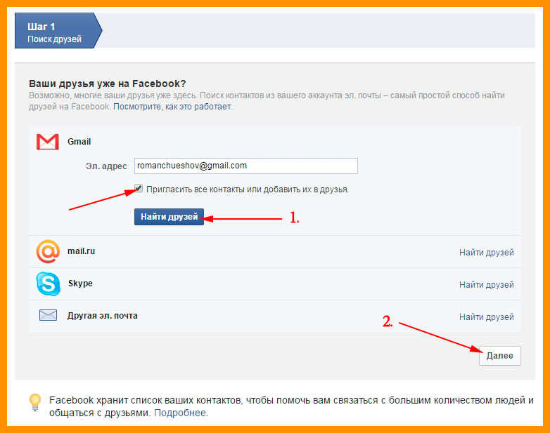 Вероятно, многие ваши друзья уже есть на Facebook. При желании, вы можете отыскать их, импортировав контакты из своего почтового ящика. Для этого выберите свой почтовый сервис, введите адрес и пароль от почты, нажмите “Найти друзей”.