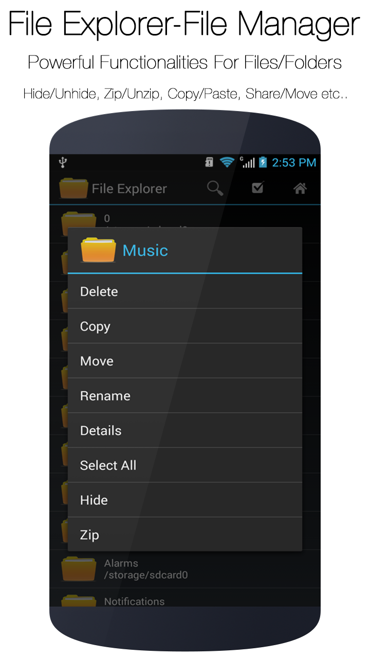 Вы найдете основные функции, такие как открытие, копирование, переименование, разархивирование, совместное использование, удаление, поиск файлов и т. Д. Поддержка поддерживаемых форматов файлов обширна, включая документы, видео, музыку, изображения, файлы ZIP и APK.