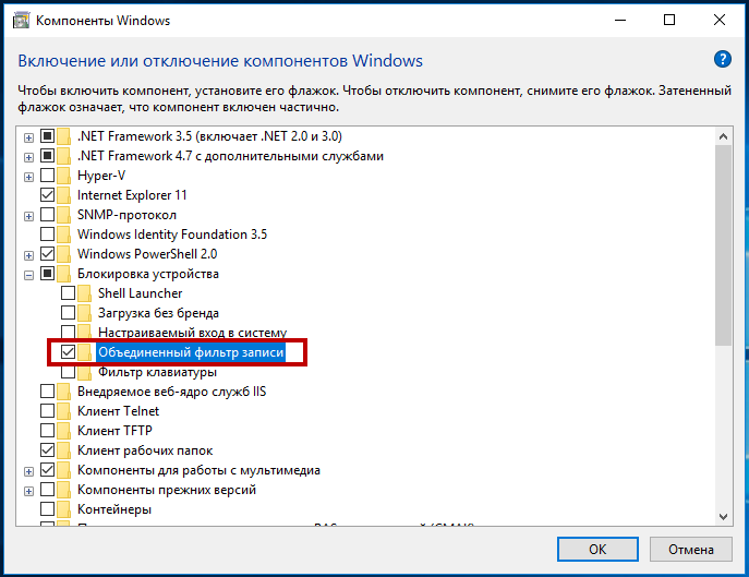 Сразу нужно отметить, что UWF не идеален, поэтому мы бы не советовали использовать его на практике. Если вы всё же решите им воспользоваться, необходимо будет внести в его работу определённые изменения. В Windows фильтр записи представлен отдельным компонентом в Панели управления (апплет «Программы и компоненты»). Чтобы его активировать, откройте окошко включения и отключения компонентов Windows, найдите и разверните элемент «Блокировка устройства» и установите галочку в пункте «Объединённый фильтр записи».