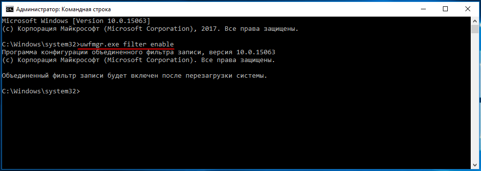 Управление установленным компонентом производится с помощью командной строки, а именно встроенной утилиты uwfmgr.exe. Включается фильтр записей командой uwfmgr.exe filter enable, отключается командой uwfmgr.exe filter disable.