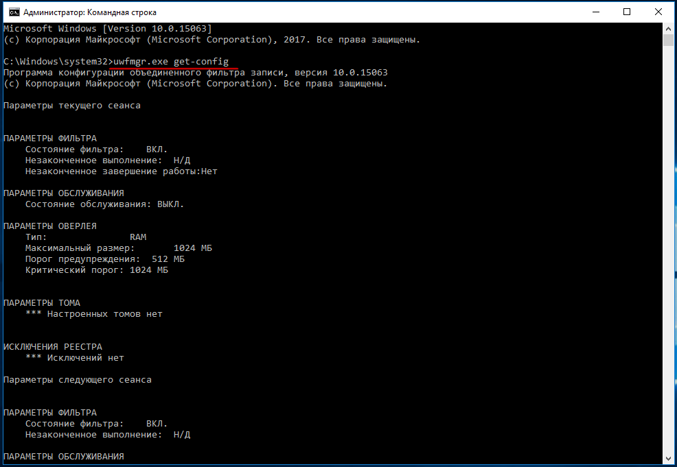 Исключение составляют внешние накопители (USB-диски), по всей видимости, защита для них отключена на программном уровне, хотя её можно и обойти. Как проверить, включена ли защита? Командой uwfmgr.exe get-config.