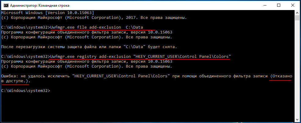 Изменения вступают в силу после перезагрузки. Для этого правила действуют свои исключения. Так, вы не можете отключить защиту UWF для системных каталогов Windows и важных ключей реестра (см. Скриншот «ошибка отказано в доступе»). При отключении UWF командой uwfmgr.exe filter disable все правила будут удалены. Защиту также можно отключить для конкретного раздела, например, фильтр записей для диска C отключается командой uwfmgr.exe volume unprotect C:.