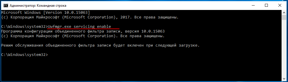 При работе с Unified Write Filter у вас может возникнуть необходимость временно отключить защиту, например, для установки обновлений системы или антивируса. В этом случае полное отключения фильтра необязательно, вместо этого его можно перевести в сервисный режим, выполнив команду Uwfmgr.exe servicing enable.