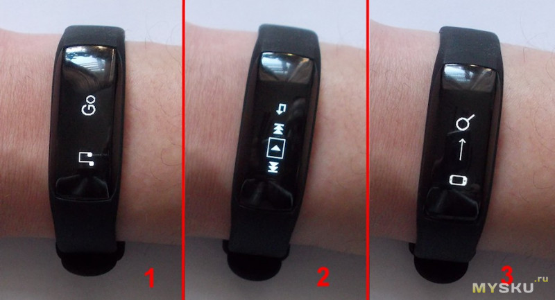 Когда браслет подключен к смартфону по Bluetooth, дополнительно доступны функции управления воспроизведением музыки (1,2) и поиска смартфона (3).