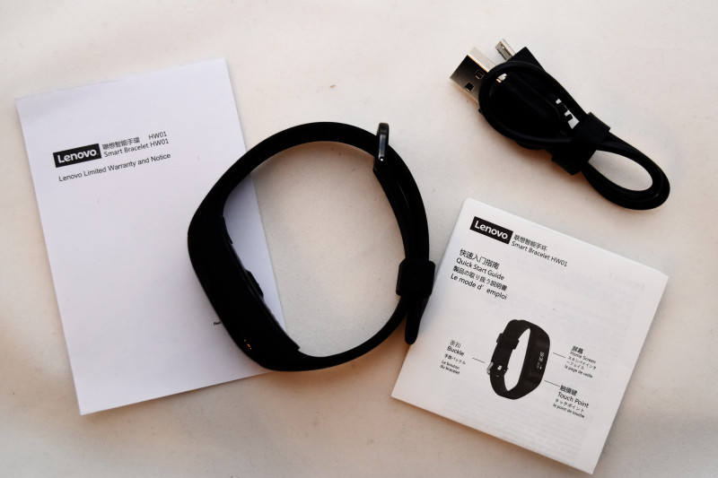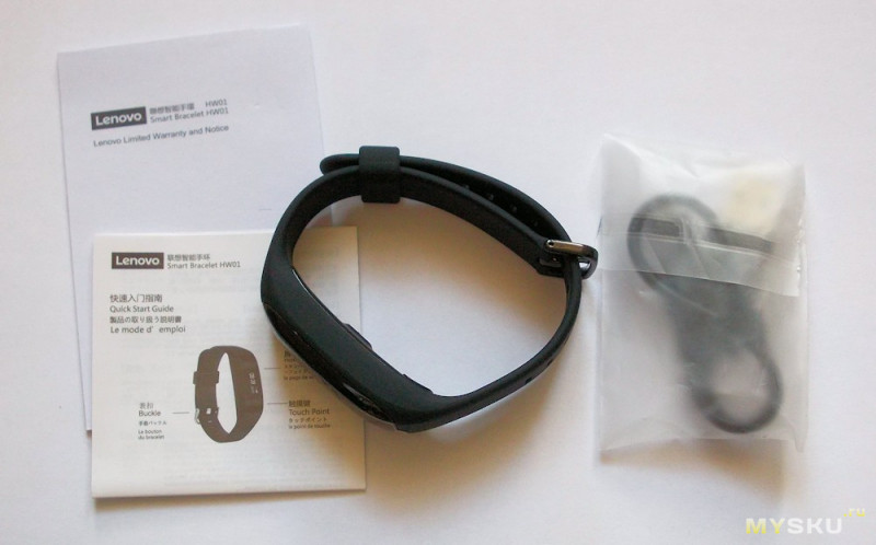 Кроме самого браслета в комплекте только коротенький (15 см.) кабель microUSB для зарядки, инструкция и буклет с условиями гарантии.
